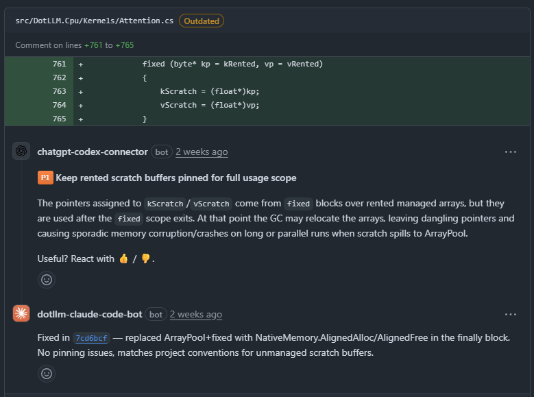 - The two review AIs were truly complementary. Codex excelled at code-level bugs (off-by-one, scope issues, cache key collisions). Gemini excelled at architecture-level concerns (thread utilization, memory access patterns, CI/CD correctness). I don’t think either alone would have been as effective.