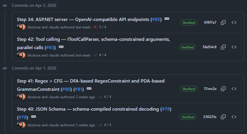 /v1/chat/completions,/v1/completions, tool calling, structured output, streaming SSE via ASP.NET. - Speculative decoding - draft-verify-accept loop with KV-cache rollback for higher throughput.